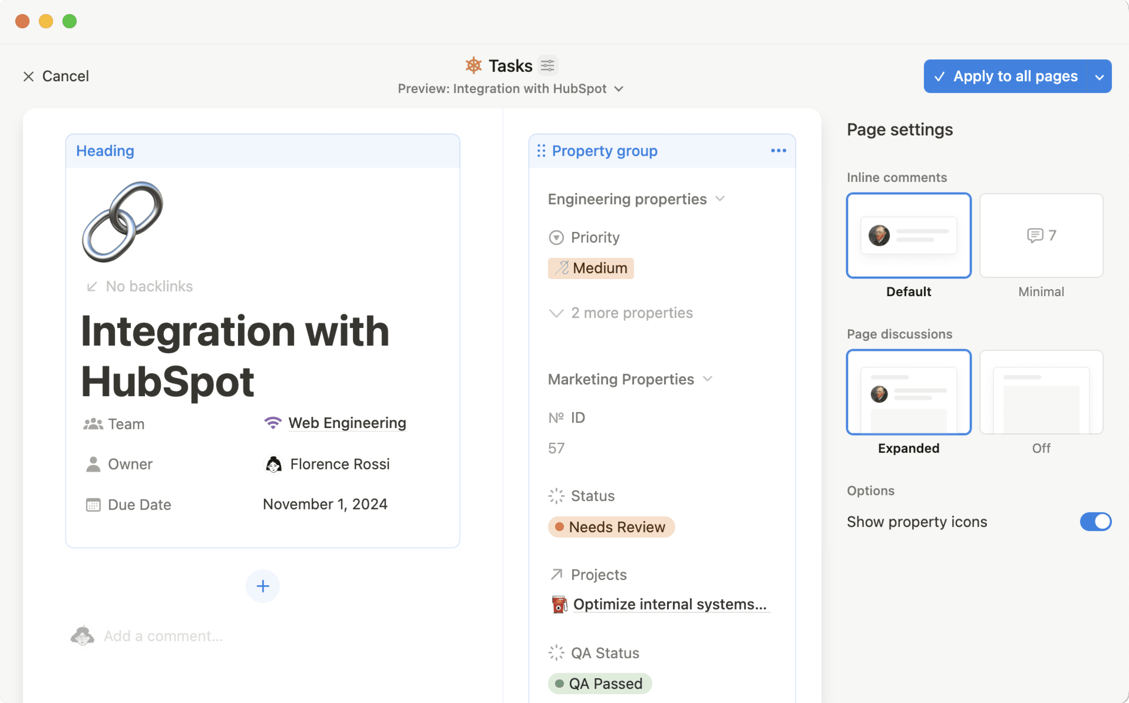 Charts drilldowns currently only appear as table views. If you want to edit a page’s properties from within a drilldown, you’ll need to open the page first.