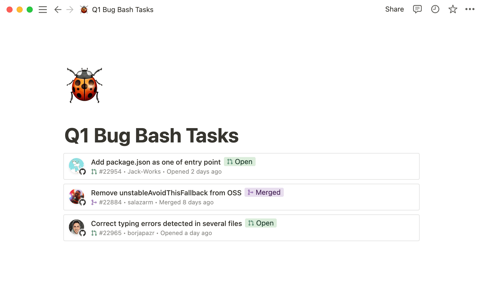 See up-to-date information from other tools, all inside your Notion workspace. Now when you paste a link from Jira, GitHub, Slack, Trello, and Asana, you can turn it into a dynamic preview — either as an inline mention or as its own block. We'll be adding support for many more tools soon; this is just the beginning!